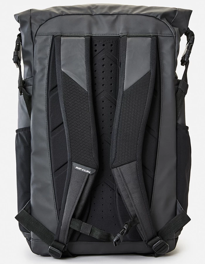 Laptop section, Roll and clip wet/dry section, Dedicated fin organizer, EVA moulded front panel for added protection, External wax & sunscreen organizer, Fleece lined tech pocket, Insulated drink bottle pocket, Breathable backpack straps.